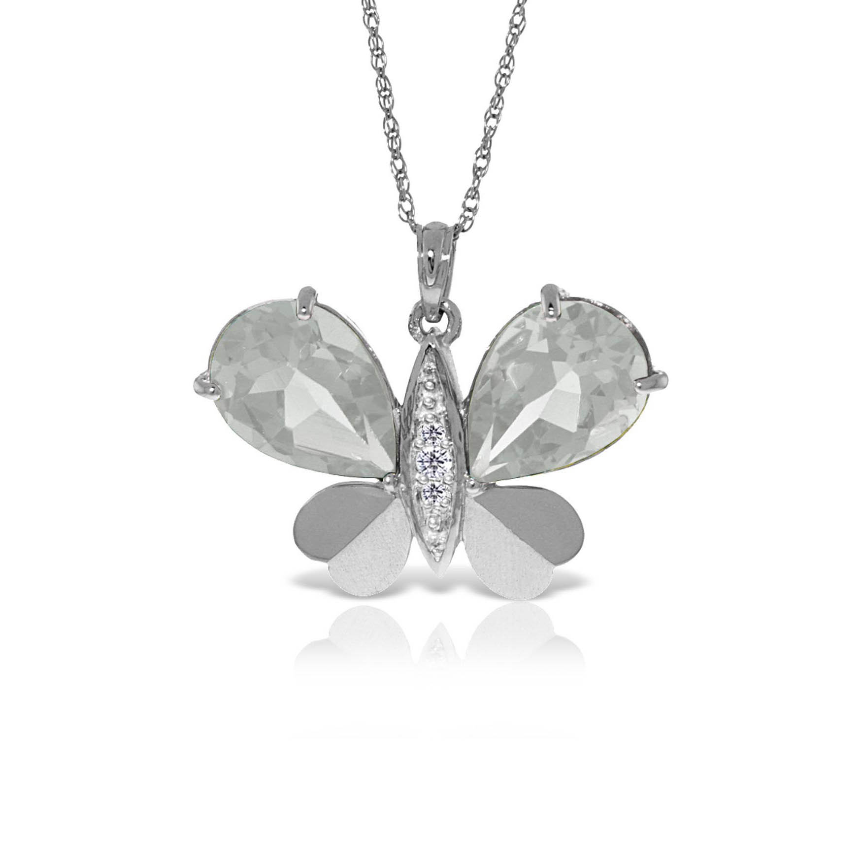 White Topaz & Diamond Butterfly Pendant Necklace handcrafted in solid white gold. Two genuine topaz, total 11 ct, three diamonds, total 0.1 ct. Pear cut. The pendant is suspended from a white gold double link rope chain with spring clasp. Size: 27.4 x 22.9 mm (1.08 x 0.9 in). Material: 9ct White Gold. Total metal weight: 5.84 gr. 2 pear cut white topaz (13 x 9 mm) = 11 ct total. 3 round cut diamonds (K colour, I3 clarity) = 0.1 ct total. Colour: White. Stone cut: Pear Cut. Anniversary: 4th Anniversary. Birthstone: November.