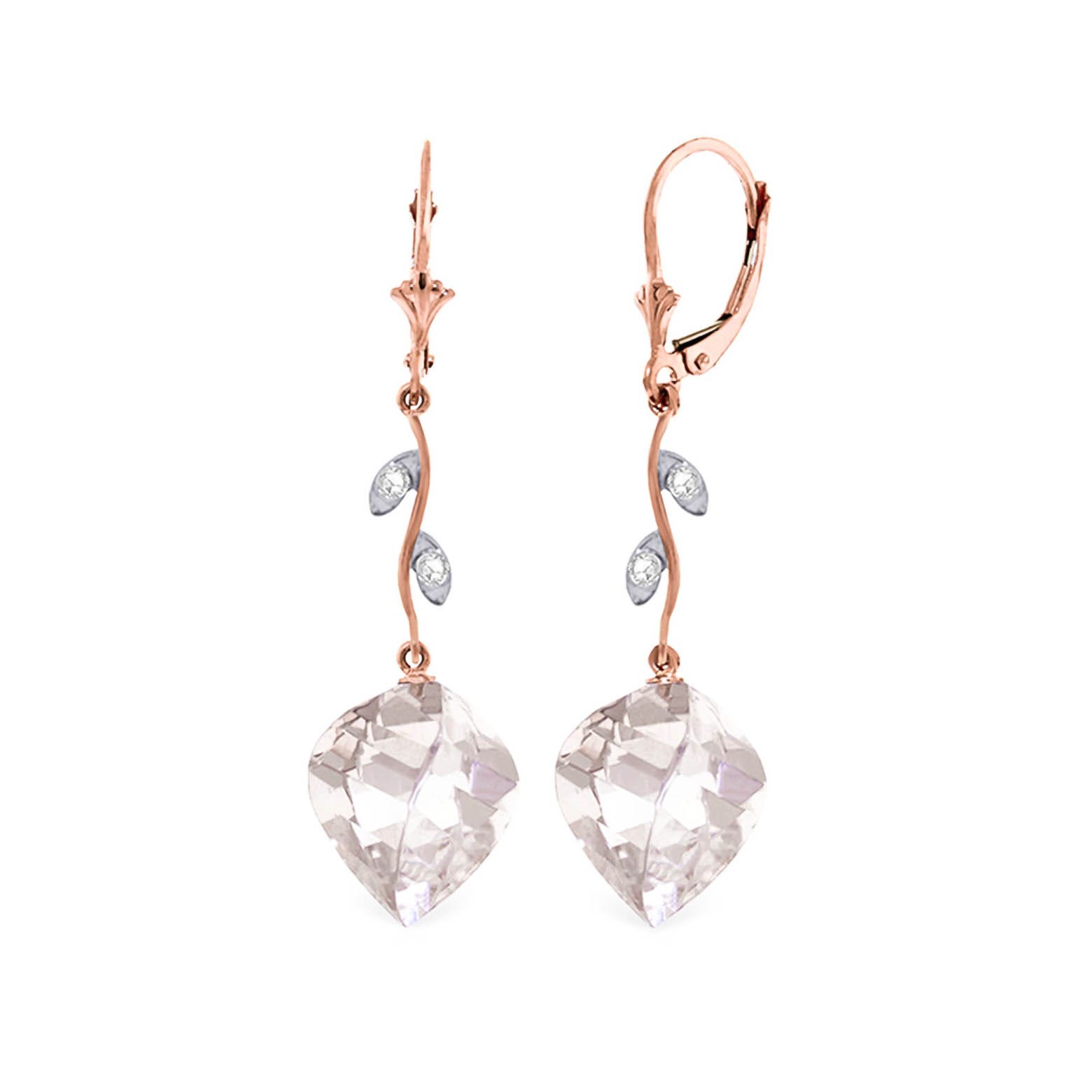 White Topaz & Diamond Chandelierdrop Earrings handcrafted in rose gold plated 9ct gold. Two genuine topaz, total 25.6 ct, four diamonds, total 0.02 ct for both earrings combined. Twisted briolette cut. Size: 12.7 x 47.8 mm (0.5 x 1.88 in). Material: 9ct Rose Gold. Total metal weight: 5.8 gr. 2 twisted briolette cut white topaz (15 x 13 mm) = 25.6 ct total for pair. 4 round cut diamonds (K colour, I3 clarity) = 0.02 ct total for pair. Colour: White. Stone cut: Twisted Briolette Cut. Anniversary: 4th Anniversary. Birthstone: November.