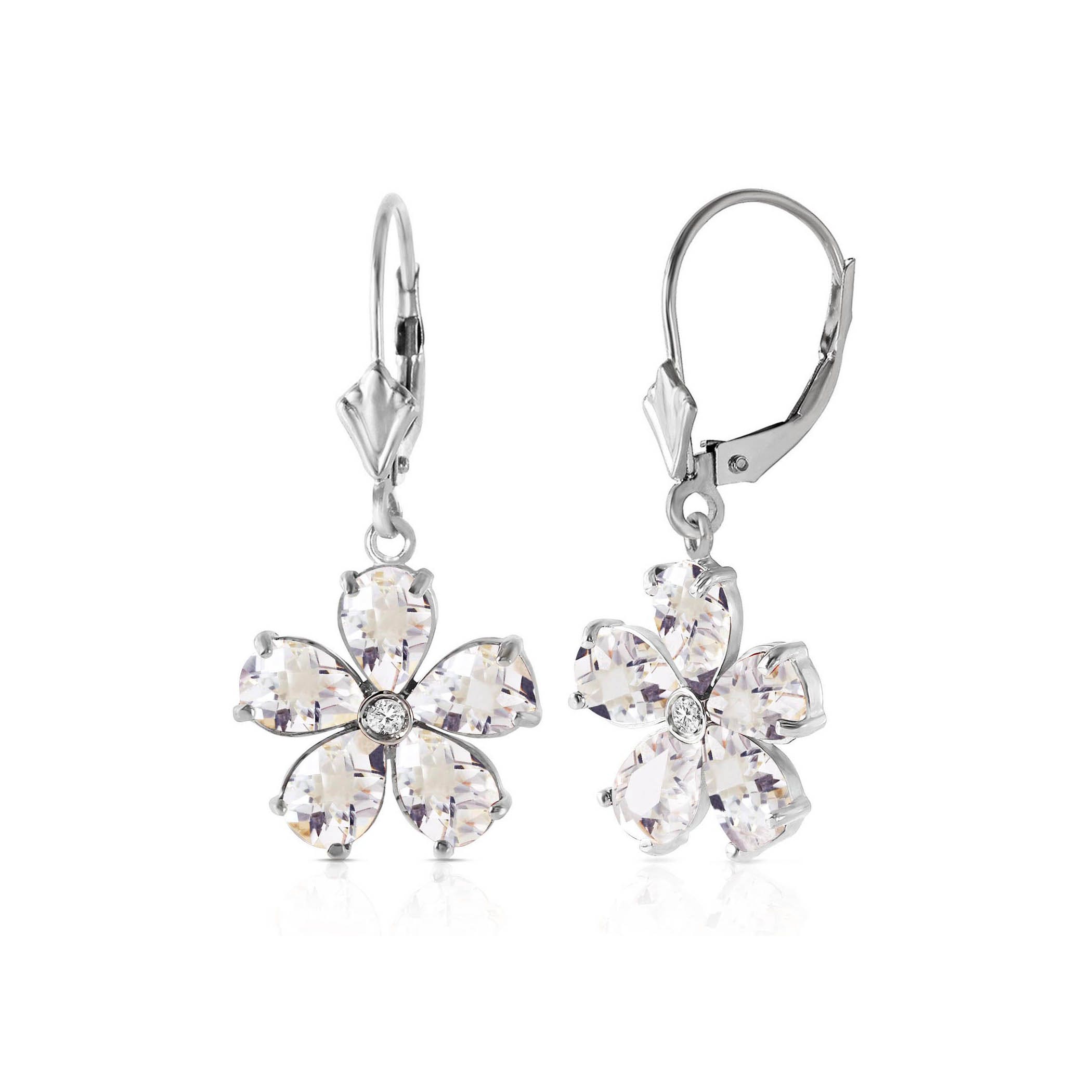 White Topaz & Diamond Leverback Earrings handcrafted in solid white gold. Ten genuine topaz, total 4.4 ct, two diamonds, total 0.03 ct for both earrings combined. Pear cut. Size: 14.2 x 30.2 mm (0.56 x 1.19 in). Material: 9ct White Gold. Total metal weight: 3.1 gr. 10 pear cut white topaz (6 x 4 mm) = 4.4 ct total for pair. 2 round cut diamonds (K colour, SI1 clarity) = 0.03 ct total for pair. Colour: White. Stone cut: Pear Cut. Anniversary: 4th Anniversary. Birthstone: November.