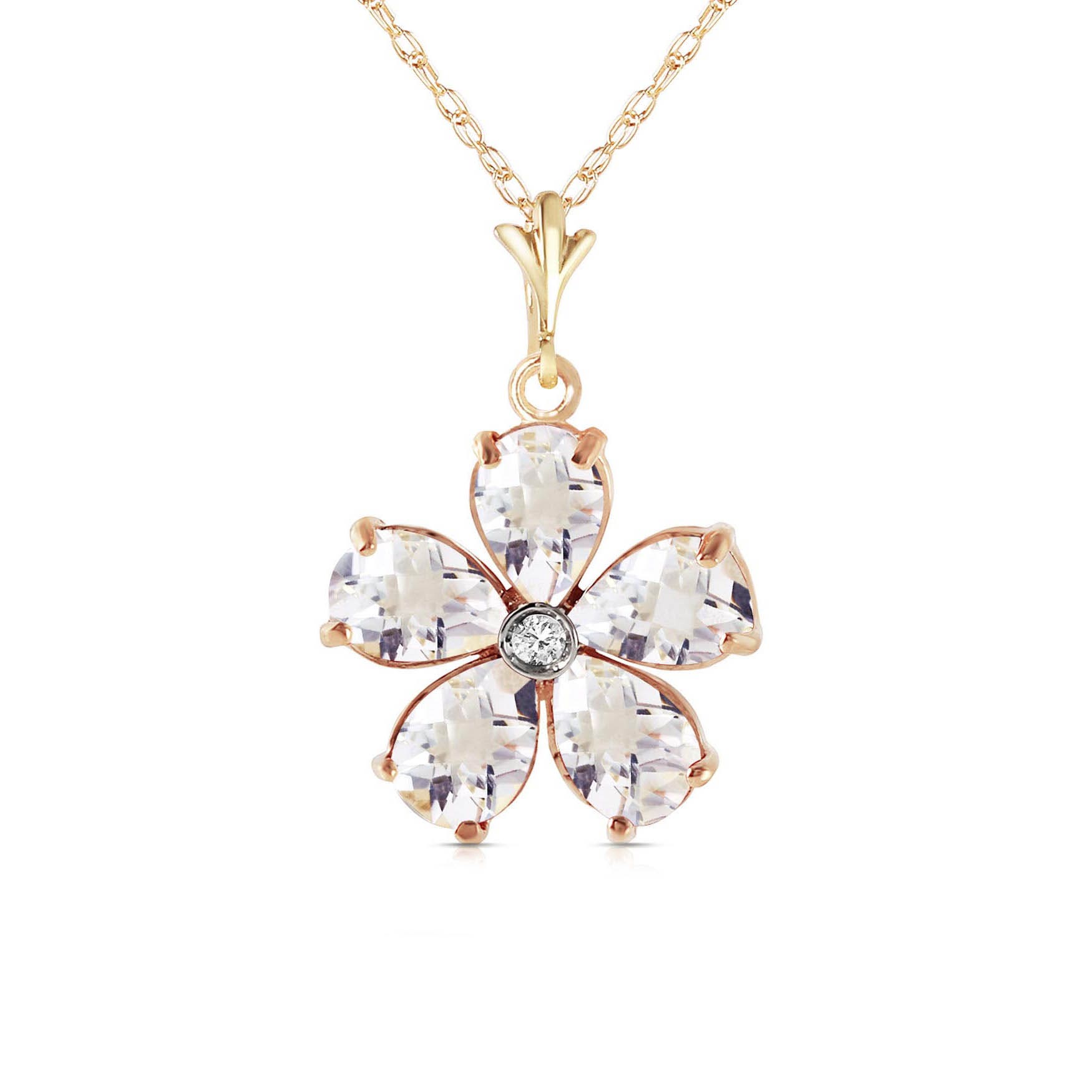 White Topaz & Diamond Pendant Necklace handcrafted in solid gold. Five genuine topaz, total 2.2 ct, single 0.02 ct diamond. Pear cut. The pendant hangs from a gold double link rope chain with spring clasp. Size: 14.2 x 22.4 mm (0.56 x 0.88 in). Material: 9ct Gold. Total metal weight: 2.24 gr. 5 pear cut white topaz (6 x 4 mm) = 2.2 ct total. 1 round brilliant cut diamond (K colour, SI1 clarity) = 0.02 ct. Colour: White. Stone cut: Pear Cut. Anniversary: 4th Anniversary. Birthstone: November.