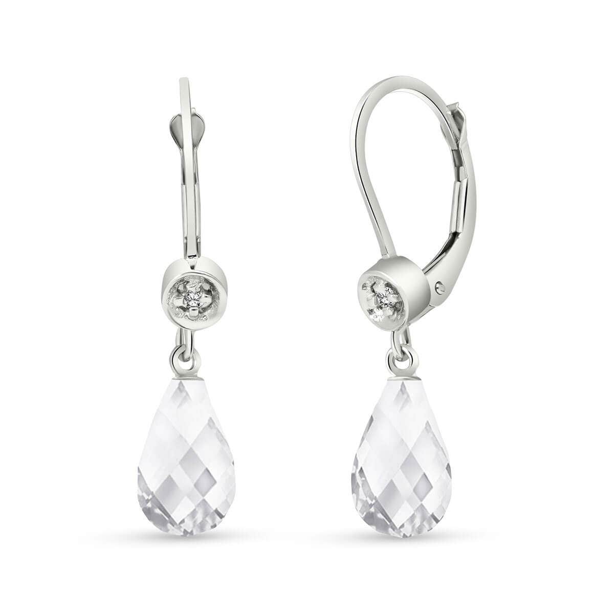 White Topaz & Diamond Leverback Earrings handcrafted in solid white gold. Two genuine topaz, total 4.5 ct, two diamonds, total 0.03 ct for both earrings combined. Briolette cut. Size: 4.1 x 27.7 mm (0.16 x 1.09 in). Material: 9ct White Gold. Total metal weight: 1.7 gr. 2 briolette cut white topaz (9 x 6 mm) = 4.5 ct total for pair. 2 round cut diamonds (K colour, SI2 clarity) = 0.03 ct total for pair. Colour: White. Stone cut: Briolette Cut. Anniversary: 4th Anniversary. Birthstone: November.