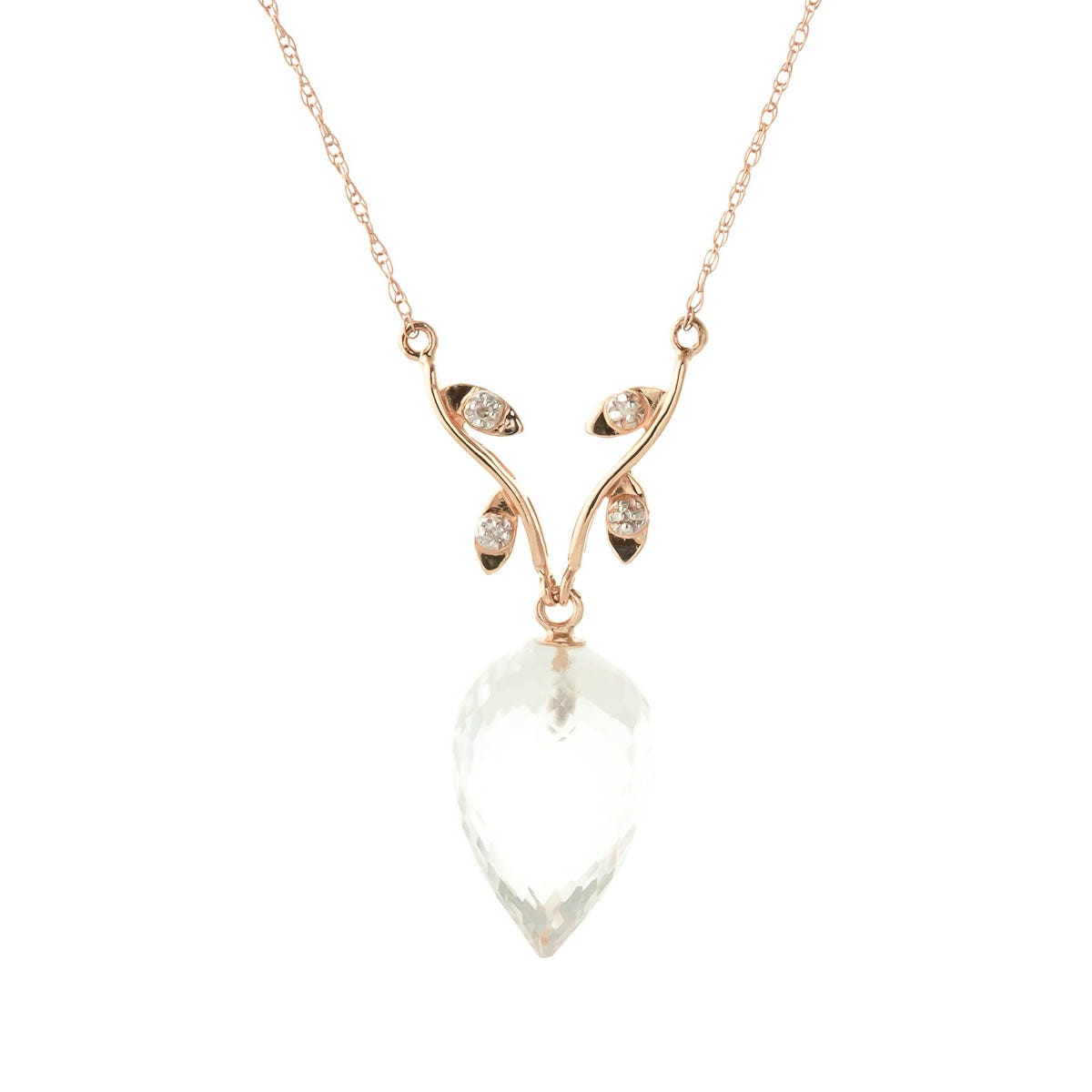 White Topaz & Diamond Pendant Necklace handcrafted in rose gold plated 9ct gold. Single 12.25 ct genuine topaz, four diamonds, total 0.02 ct. Pointed briolette cut. The pendant is suspended from a rose gold double link rope chain with spring clasp. Size: 17.8 mm (0.7 in). Material: 9ct Rose Gold. Total metal weight: 3.74 gr. 1 pointed briolette cut white topaz (15 x 10 mm) = 12.25 ct. 4 round cut diamonds (K colour, I3 clarity) = 0.02 ct total. Colour: White. Stone cut: Pointed Briolette Cut. Anniversary: 4th Anniversary. Birthstone: November.