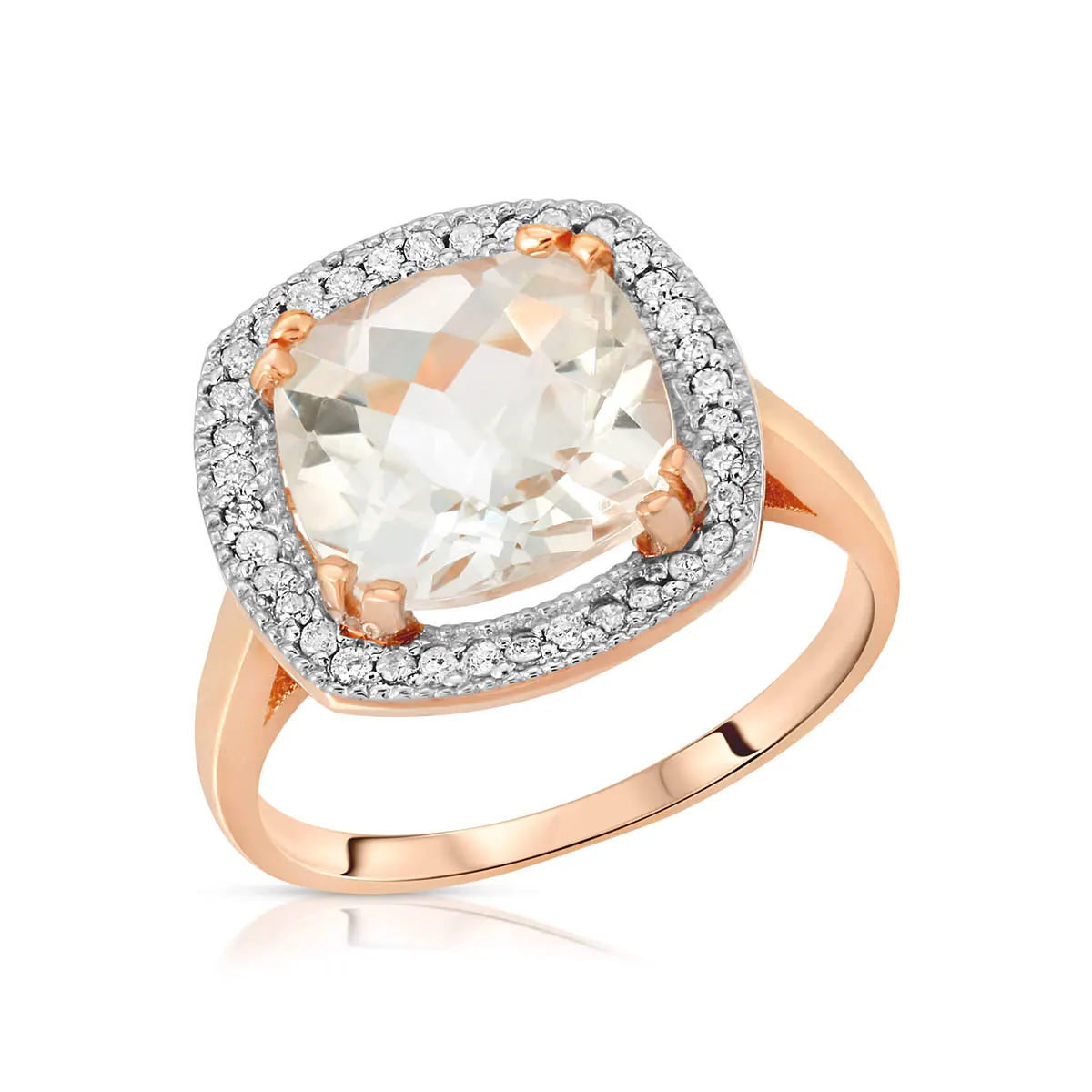 White Topaz & Diamond Ring handcrafted in solid 18ct rose gold. Single 5 ct genuine topaz, 36 diamonds, total 0.2 ct. Cushion cut. Available from sizes H to Z including half sizes. Size: 14 mm (0.55 in). Material: 18ct Rose Gold. Total metal weight: 5.3 gr. 1 cushion cut white topaz (10 x 10 mm) = 5 ct. 36 round cut diamonds (H colour, SI1 clarity) = 0.2 ct total. Colour: White. Stone cut: Cushion Cut. Anniversary: 4th Anniversary. Birthstone: November.