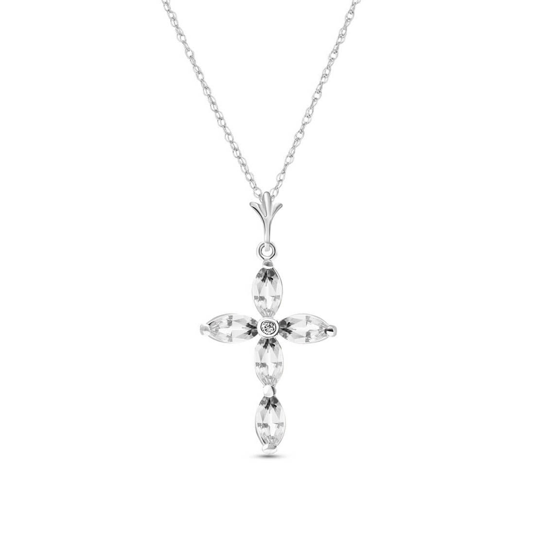 White Topaz & Diamond Pendant Necklace handcrafted in solid white gold. Five genuine topaz, total 1.08 ct, single 0.15 ct diamond. Marquise cut. The pendant is suspended from a white gold double link rope chain with spring clasp. Size: 15.2 x 28.7 mm (0.6 x 1.13 in). Material: 9ct White Gold. Total metal weight: 1.94 gr. 5 marquise cut white topaz (6 x 3 mm) = 1.08 ct total. 1 round brilliant cut diamond (K colour, SI1 clarity) = 0.15 ct. Colour: White. Stone cut: Marquise Cut. Anniversary: 4th Anniversary. Birthstone: November.