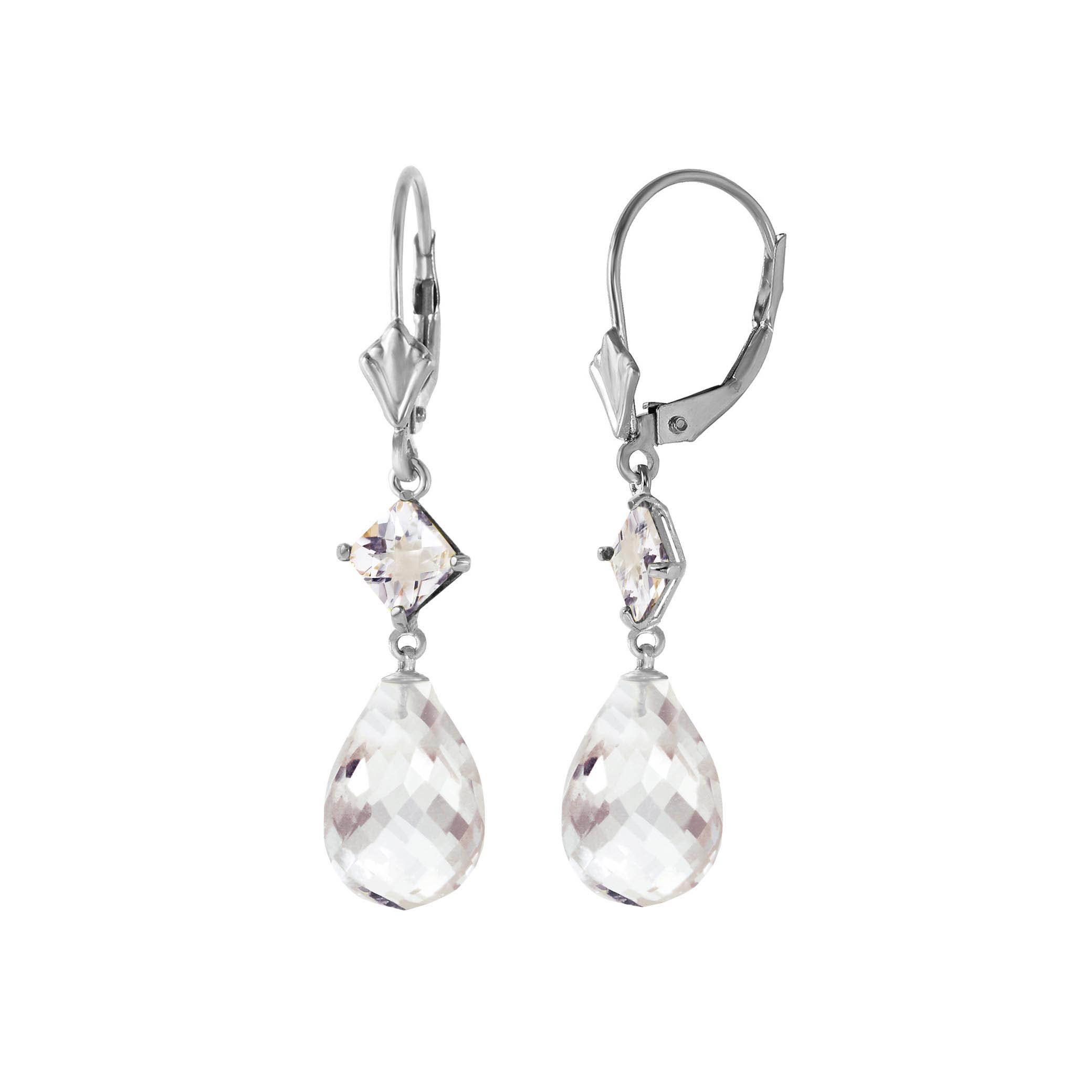 White Topaz Leverback Earrings handcrafted in solid white gold. Four gemstones, total 11 ct for both earrings combined. Briolette cut. Size: 7.9 x 37.6 mm (0.31 x 1.48 in). Material: 9ct White Gold. Total metal weight: 3.0 gr. 2 briolette cut white topaz (12 x 8 mm) = 10 ct total for pair. 2 square cut white topaz (4 x 4 mm) = 1 ct total for pair. Colour: White. Stone cut: Briolette Cut. Anniversary: 4th Anniversary. Birthstone: November.