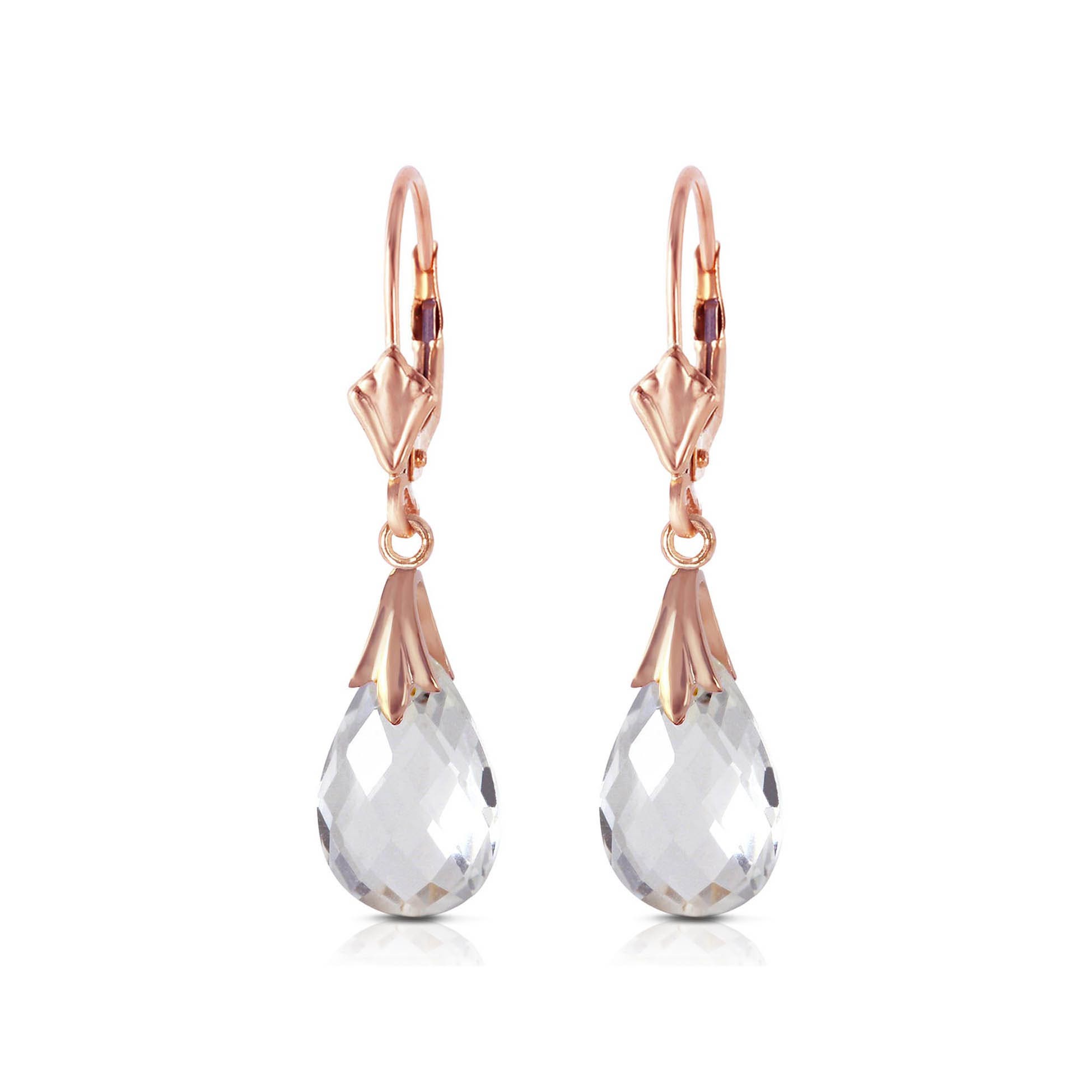 White Topaz Leverback Earrings handcrafted in rose gold plated 9ct gold. Two genuine topaz, total 6 ct for both earrings combined. Briolette cut. Size: 7.6 x 31.5 mm (0.3 x 1.24 in). Material: 9ct Rose Gold. Total metal weight: 2.0 gr. 2 briolette cut white topaz (12 x 8 mm) = 6 ct total for pair. Colour: White. Stone cut: Briolette Cut. Anniversary: 4th Anniversary. Birthstone: November.